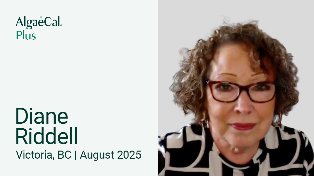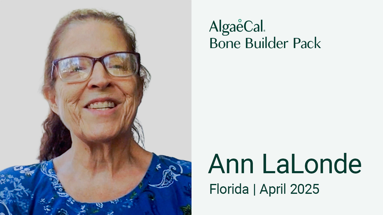 So I looked into it and I was really impressed and I started it. A year later, I had a bone density test and it was normal and I again had another bone density test done last summer and my test again was normal.  I have been so impressed with AlgaeCal because of the education, the product quality. I've learned a lot and I already was, you know, exercising and eating well, but I'm now even more more knowledgeable about what it takes for me as a mature woman to look after my body and my my bones. So how important it is for the exercise and the eating right and the taking calcium, and I think everything's wrapped up in the AlgaeCal products.